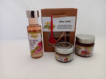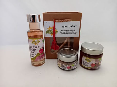 Bio-Rosenblütensirup, getrocknete Bio-Rosenblütenblätter,